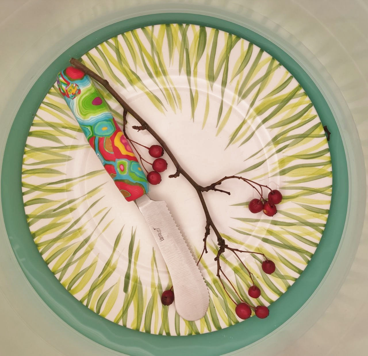 Messer aus Edelstahl mit buntem Griff aus Polymer Clay.
