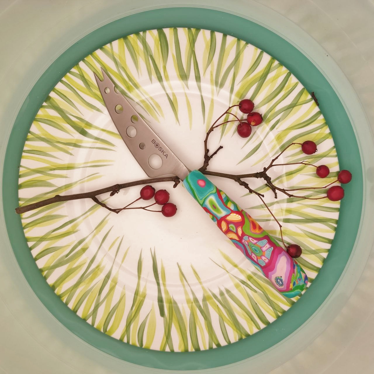Käsemesser aus Edelstahl mit buntem Griff aus Polymer Clay.