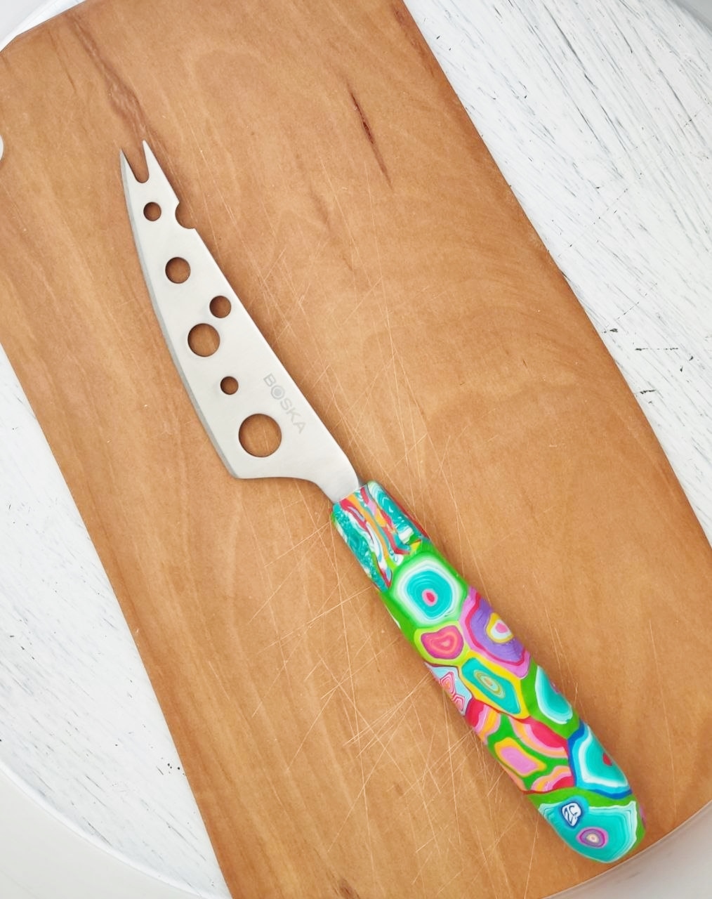 Käsemesser aus Edelstahl mit buntem Griff aus Polymer Clay.