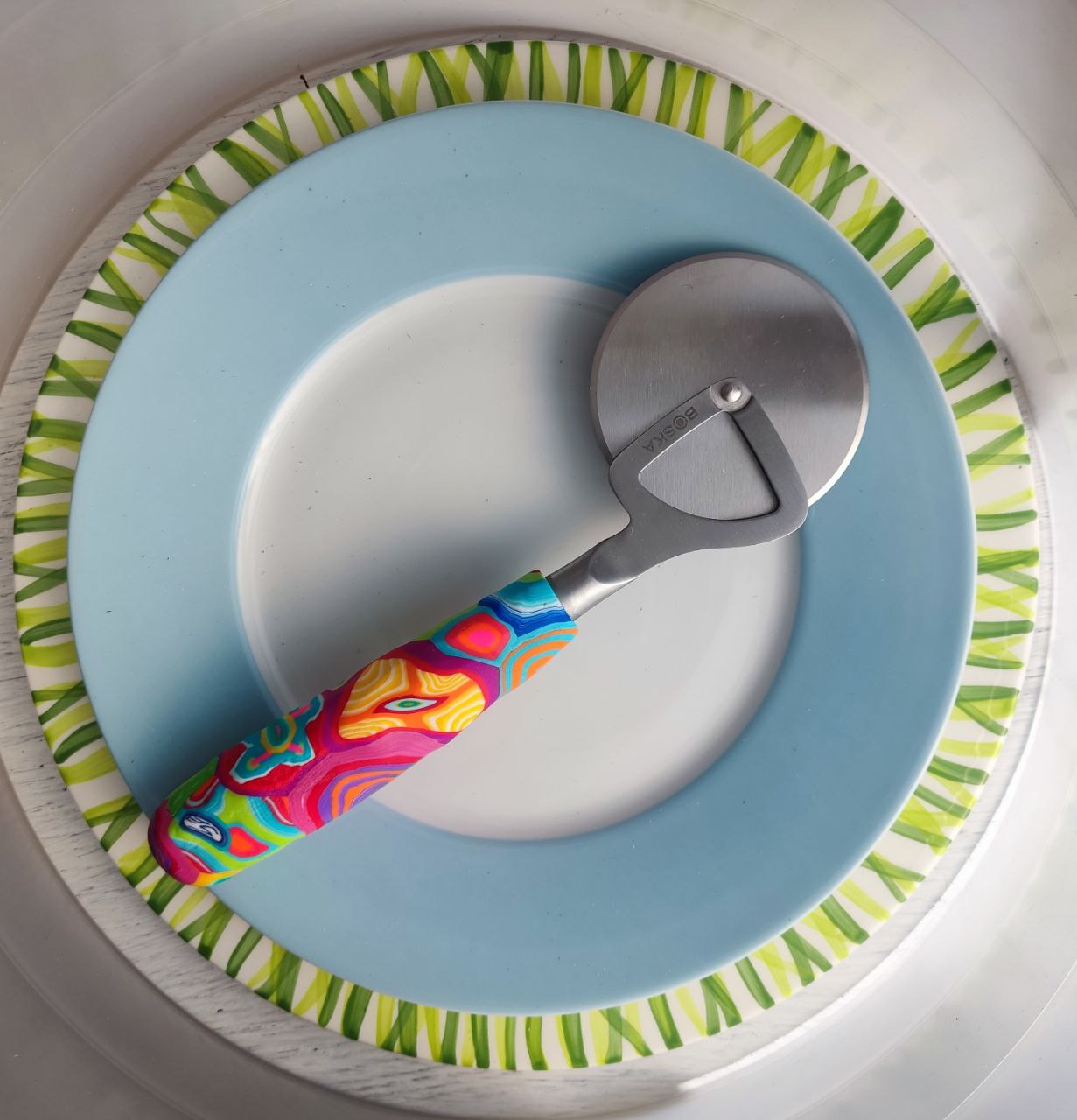 Pizzaschneider aus Edelstahl mit buntem Griff aus Polymer Clay.