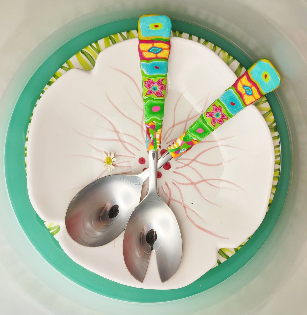 Salatbesteck Edelstahl mit buntem Griff aus Polymer Clay.
