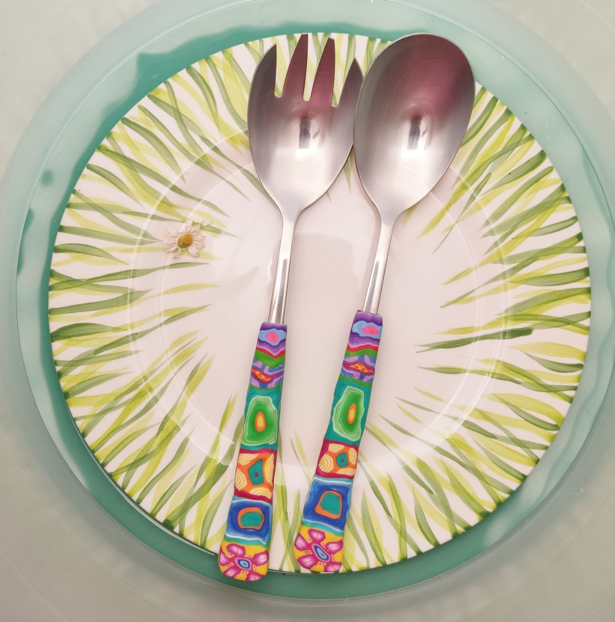 Salatbesteck mit buntem Griff aus Polymer Clay.