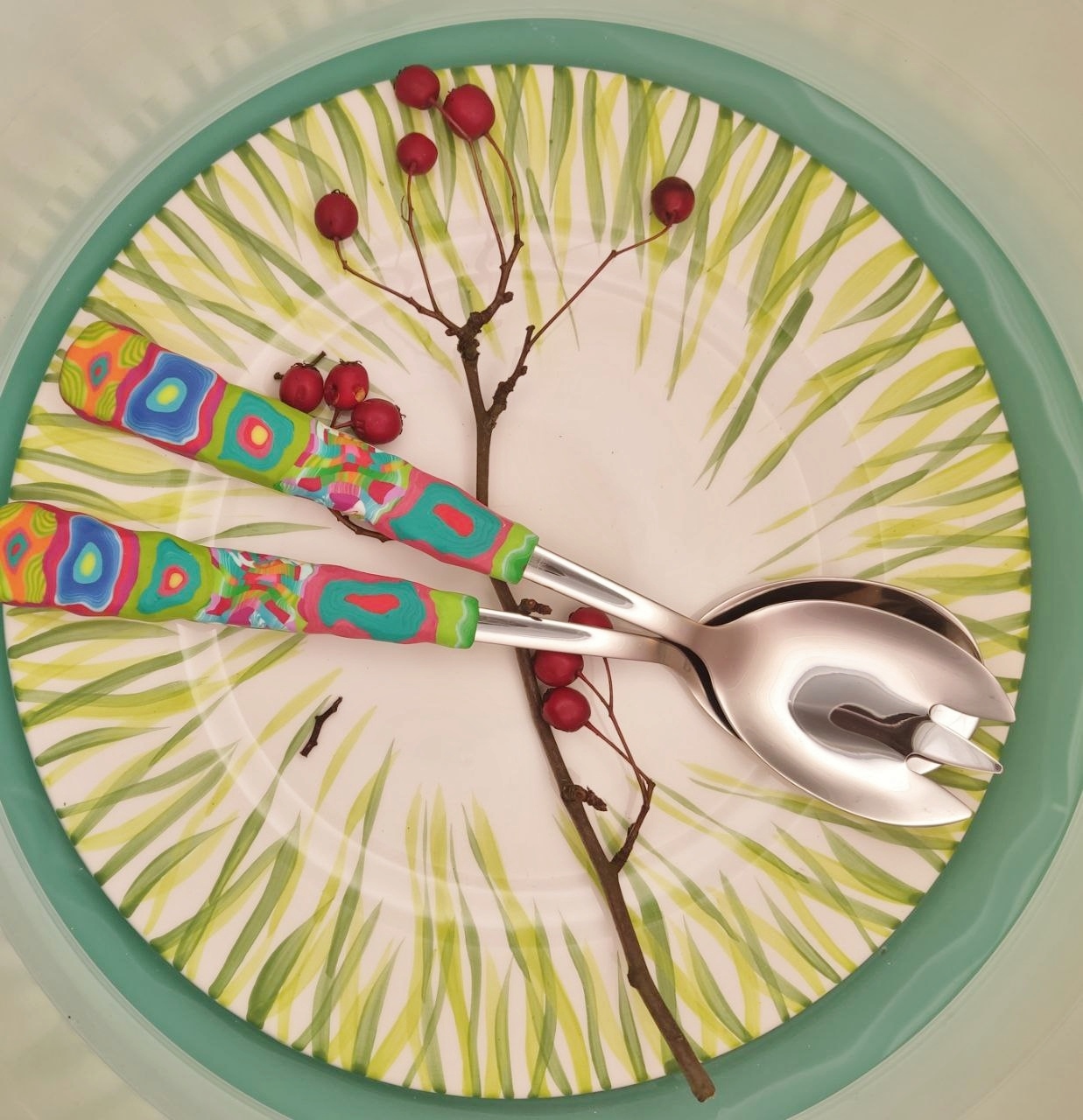 Salatbesteck  mit buntem Griff aus Polymer Clay.