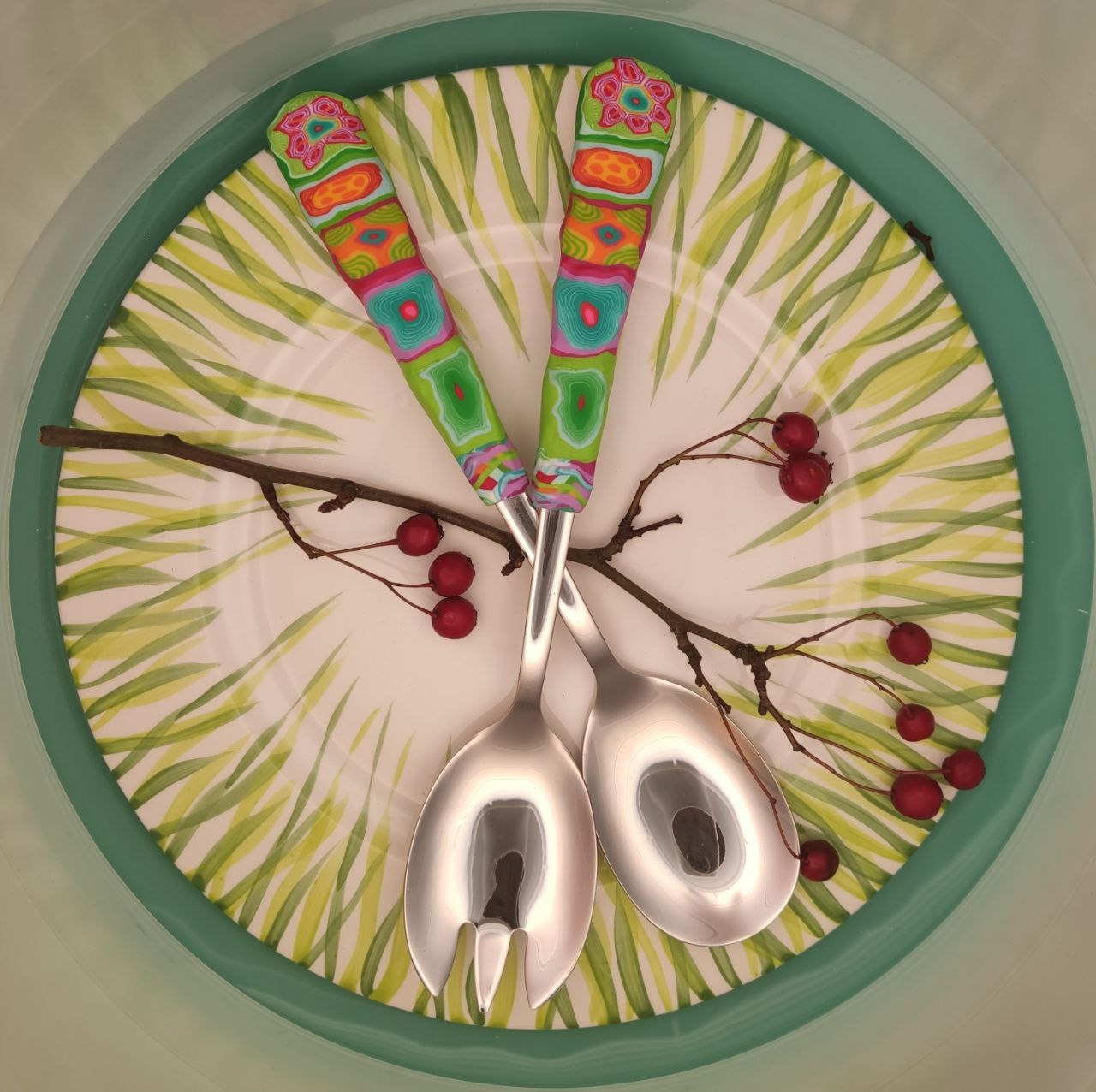Salatbesteck mit buntem Griff aus Polymer Clay.