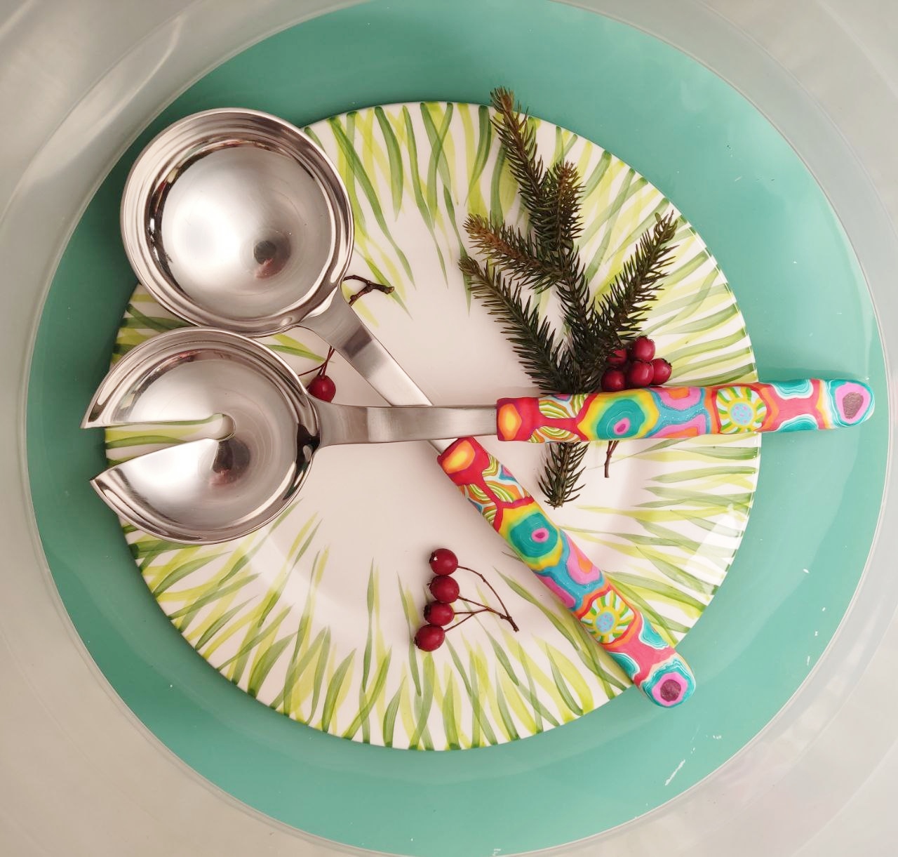 Salatbesteck mit buntem Griff aus Polymer Clay.